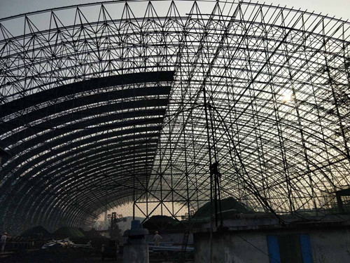 受检煤棚位于湖北省鄂州市,原作为露天煤场,现在根据需要改造为钢结构网架封闭煤场,2019年6月8日开始施工,煤棚平面呈矩形,东西向轴线尺寸为310m,南北向轴线尺寸为126m,建筑面积约为39060㎡,煤棚总高39.957m。为了解目前钢结构网架挠度现状,特委托我厂房检测中心对其展开现场钢结构网架挠度检测并出具报告。